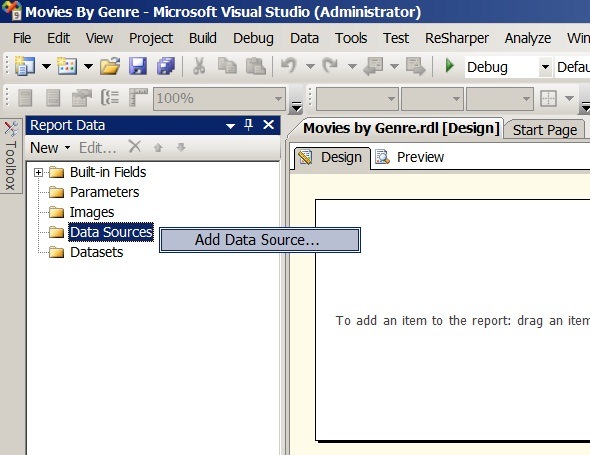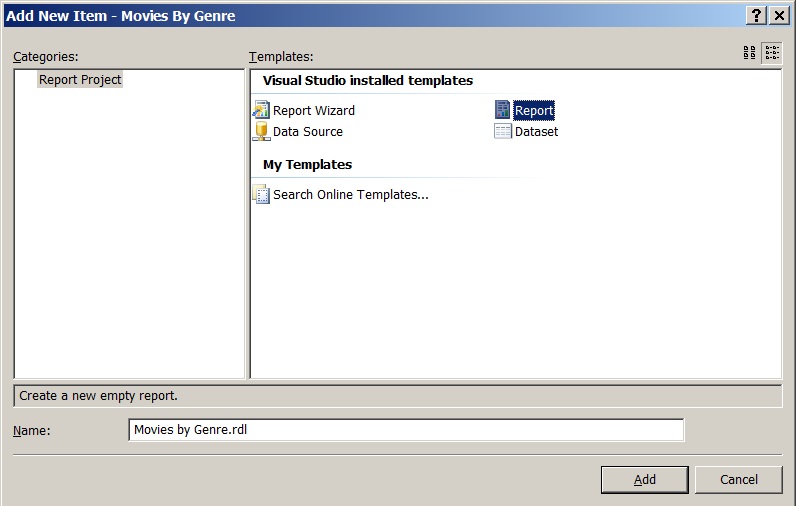 7) In the "Add New Item" window, select a file of type Report. I will give this report a name "Movies by Genre".