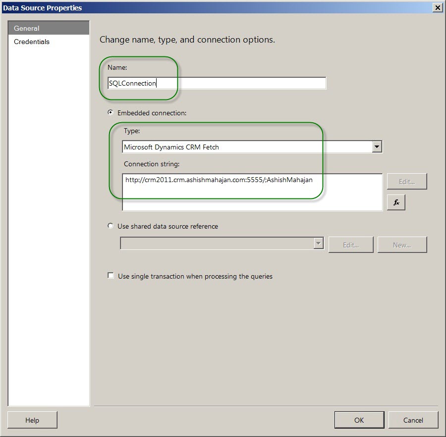 I have named my data source as "SQLConnection". In the embedded connection, select the type as "Microsoft Dynamics CRM Fetch".