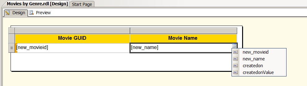 In the table data row, for first column I will click on upper right corner and select new_movieid. I will do the same for second column (as shown below) and select new_name. These field options appear automatically as I have already set the DataSetName property of the table equal to "GetMovies" dataset.
