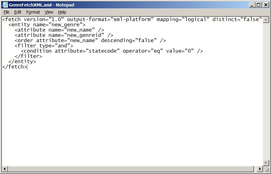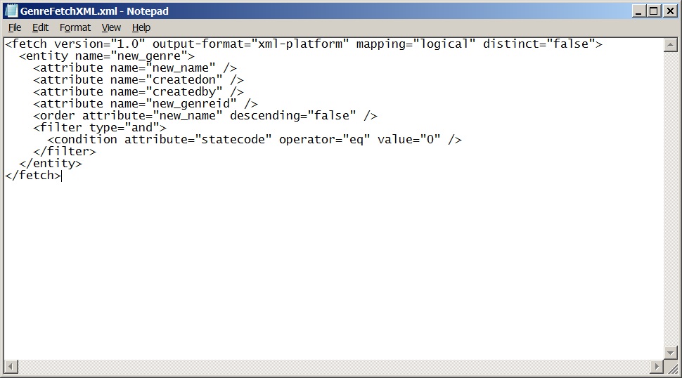 I want the Genre query to retrieve only Name and the GUID, so that I can create a report parameter with a pick list of all Genres. The Fetch XML has 2 additional fields "createdon" and "createdby". I will remove these 2 fields.