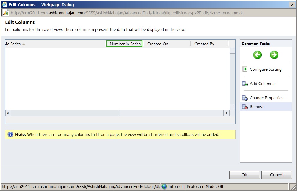 26) This will open the "Edit Columns" window. I will remove the last three columns "Number in Series", "Created On" and "Created By", as I don't need them. Select each one of the three columns and click "Remove" button. Click OK.