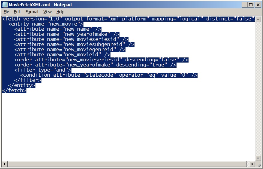 30) As you can see the Movie Fetch XML has the columns which I selected. I will copy this Movie Fetch XML and use it in the Movie dataset.