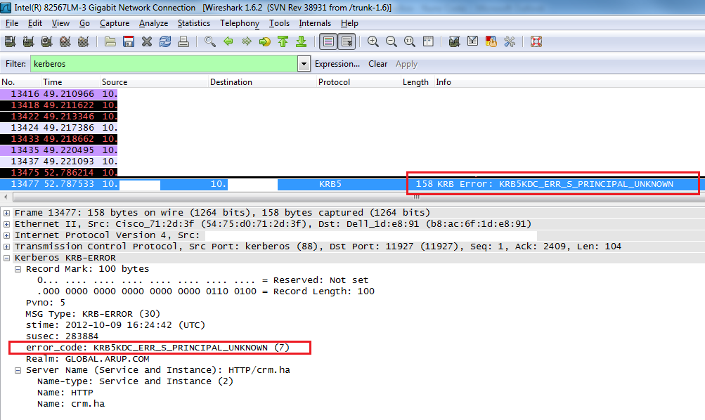 Wireshark shows a packet with error: KRB5KDC_ERR_S_PRINCIPAL_UNKNOWN highlight this packet and on the below screen expand the Kerberos packet details and you find that the missing DNS is HTTP/crm.ha Kerberos