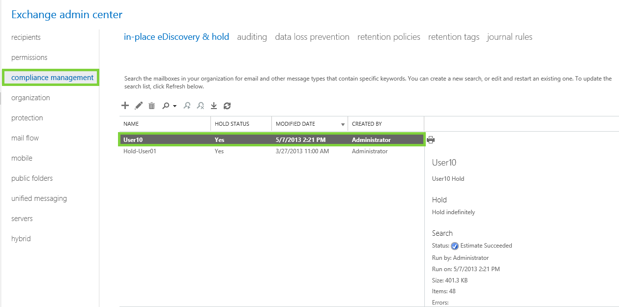 Para ativar In-Place Hold para o usuário User10 execute o cmdlet no Exchange Management Shell.
