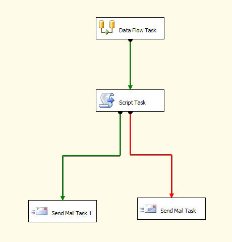 At the above screenshot, we added a 'Script Task' task to process the data coming from the Data Flow, we then send an email either if the package runs successful or fails.