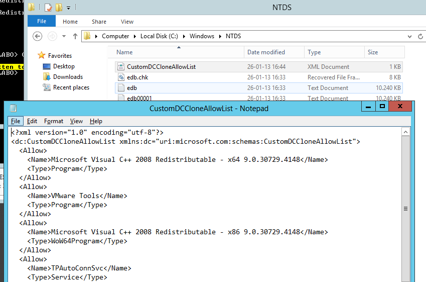 TechNet tells us that we need to launch the first command before starting the cloning process. Indeed, we need to determine what programs and services are not present on the default supported list "DefaultDCCloneAllowList.xml" or a user-defined inclusion list named "CustomDCCloneAllowList.xml" and therefore not supported by the cloning process because it has not been evaluated for cloning impact.