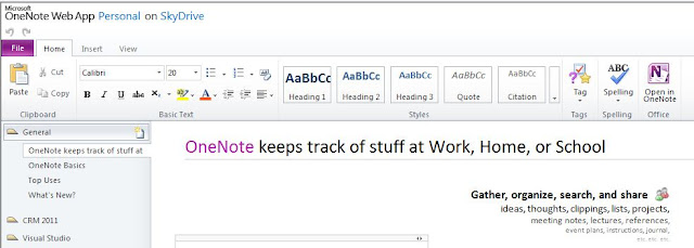 Below is the Ribbon Interface for Microsoft One Note 2010 online. Shown below is my One Note on my SkyDrive.