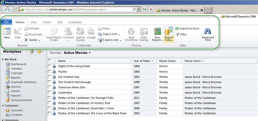 | Ribbon Interface in Microsoft Dynamics CRM 2011 Movie Entity Record |